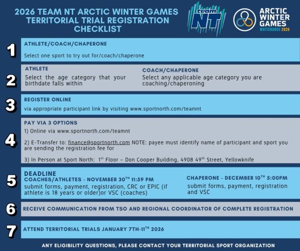 The Territorial Trials will be held January 7–11, 2026 in Yellowknife. To register, please review the Territorial Trials Registration Checklist. All athletes registering must have a valid Volleyball NT membership.